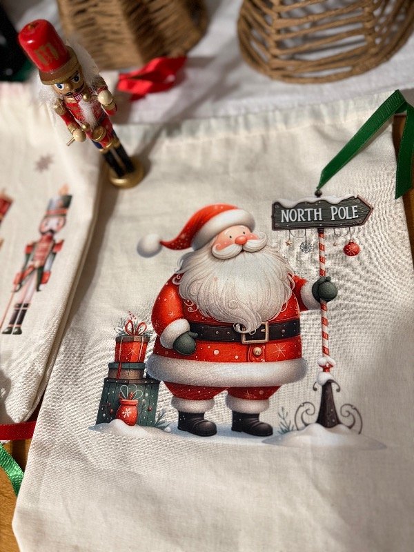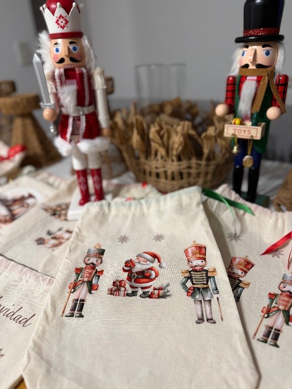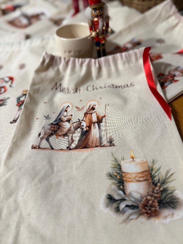 Bolsas de lienzo con estampa navideñas. Medidas 30x27 , con cinta de raso roja/verde . Pack por 3 unidades, diseños aleatorios. Tu packaging ideal para estas fiestas